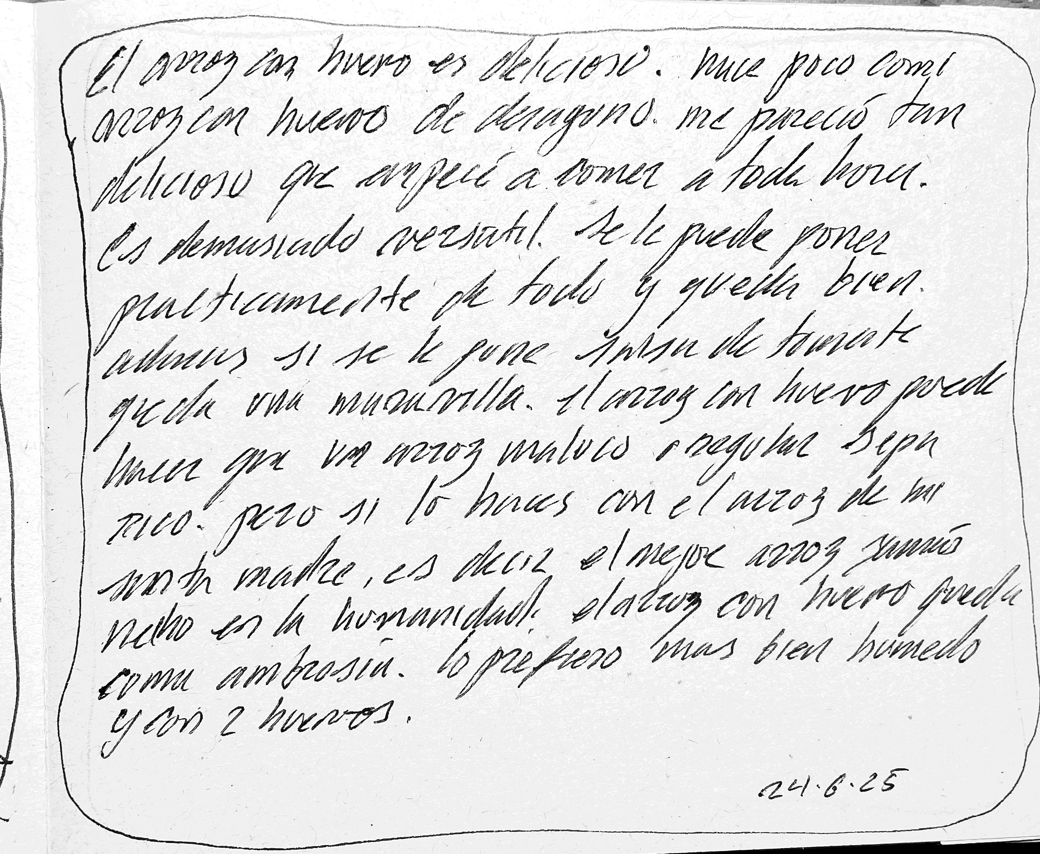 El arroz con huevo es delicioso. Nace poco comí arroz con huevo de desayuno. Me parecía tan delicioso que empecé a comer a toda hora. Es demasiado versátil. Se le puede poner prácticamente de todo y queda bien. Además si se le pone un poquito de tomate queda una maravilla. El arroz con huevo puede hacer que un arroz malo o regular sepa rico. Pero si lo haces con el arroz de tu santa madre, es decir, el mejor arroz jamás hecho en la humanidad, el arroz con huevo puede ser una ambrosía. Lo prefiero más bien húmedo y con 2 huevos. 24.6.25