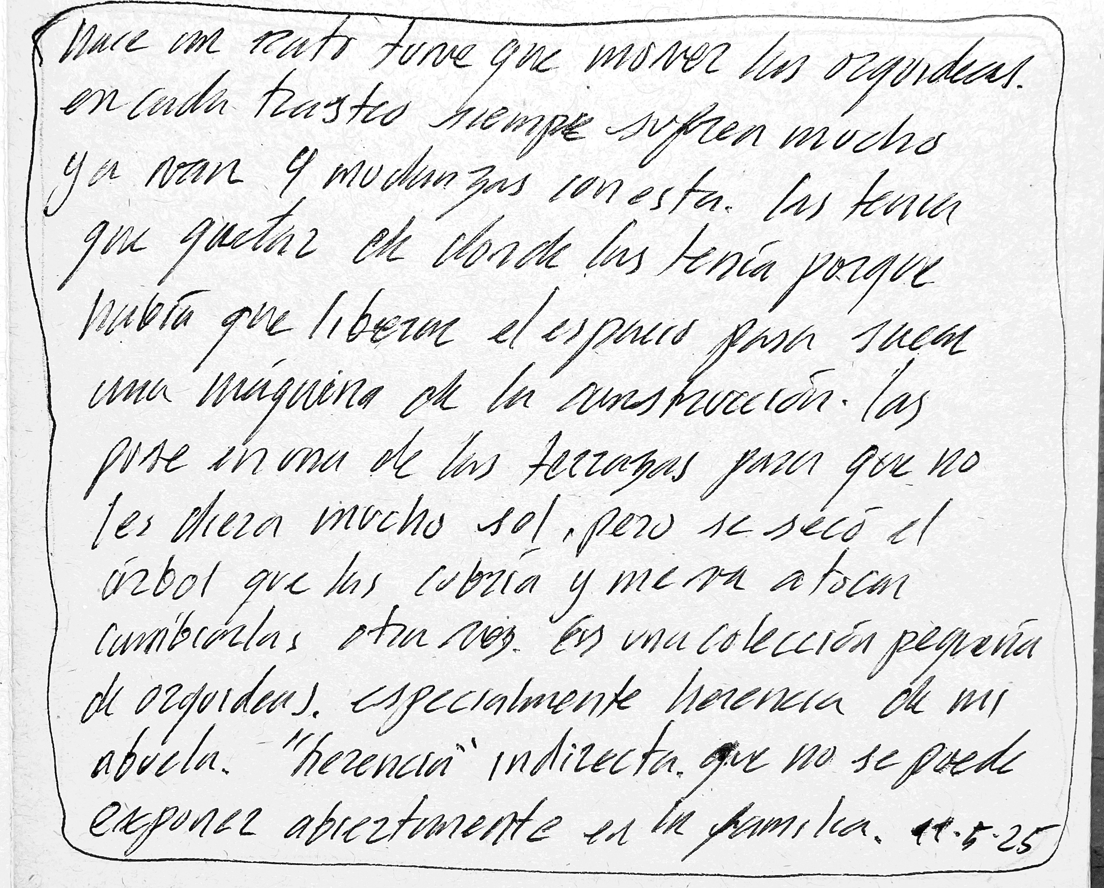 Hace un rato tuve que mover las segundas. En cada trasteo siempre sufren muchos ya sean mudanzas con esta. Las tenía que quitar de donde las tenía porque había que liberar el espacio para sacar una máquina de la construcción. Las puse en una de las terrazas para que no les diera mucho sol, pero se secó el árbol que las cubría y me toca cambiarlas otra vez. Es una colección pequeña de segundas, especialmente herencia de mi abuela. “Herencia” indirecta, que no se puede exponer abiertamente en la familia. 11-5-25